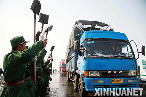 当日,武警安徽总队直属支队800名官兵在合宁高速公路合肥机场至龙塘路段清除路面冰雪。经过4小时奋战,共清除10公里结冰路段,使被困车辆重新踏上旅途。